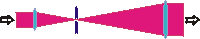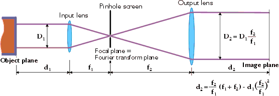 Jak je zřejmé z obrázku, výstupní rovina laserového zesilovače představuje předmětovou rovinu konfokálního optického systému tvořeného prostorovým filtrem. Jestliže (f2/f1) * (f1 + f2) > d1, pak profil intenzity svazku v této rovině je zobrazen (přenesen) do vzdálenosti d2 = (f2/f1) * (f1 + f2) – d1 * (f2/f1)2 za výstupní čočkou.