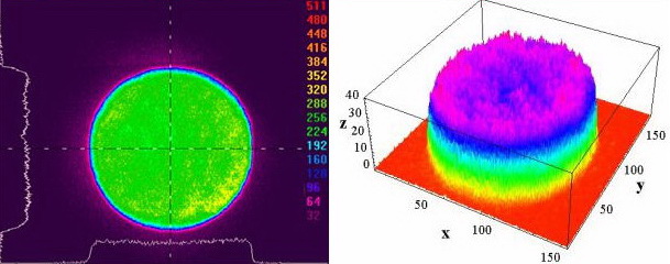 Pro laserový systém PALS je charakteristická vysoká kvalita výstupního laserového svazku, tj. vysoká prostorová homogenita jeho intenzity. Následující obrázky ve falešných barvách ukazují jednak vrstevnicovou mapu prostorového rozložení intenzity po průřezu svazku, sejmutou pomocí infračervené kamery svazkového analyzátoru Spiricon, s příčnými řezy intenzitním profilem, jednak prostorový 3D obrázek příslušného profilu.