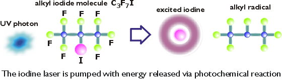 Za prvé, výtěžek produkce excitovaných atomů jódu z mateřských alkyljodidových molekul je značně vysoký (téměř 50 %), protože fotolýzou vzniká méně nežádoucích vedlejších produktů. Výsledná relativně jednoduchá chemická kinetika navíc dovoluje po každém výstřelu provádět regeneraci laserového média a umožňuje tak hospodárný provoz celého systému.