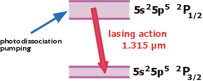 K laserové akci dochází mezi hladinami jemné struktury 2P1/2 a 2P3/2 základní konfigurace 5s25p5 neutrálního atomu jódu. Elektronová konfigurace těchto dvou hladin je zde popsána spektroskopickou notací příslušející tzv. LS vazbě, kterou lze aplikovat na atomy se slabou spin-orbitální interakcí. Horní levý index značí multiplicitu elektronového spinu, velké písmeno charakterizuje orbitální moment hybnosti a index vpravo dole vyjadřuje celkovou hodnotu elektronového momentu hybnosti.