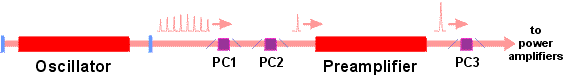Proces výběru počátečního pulzu je poměrně rafinovaný. Nejprve se elektro-optickým preselektorem (na obrázku není znázorněn) vybere jiný pulz, těsně před maximem amplitudy sekvence, a zavede se do předzesilovače. Tímto zesíleným pulzem se aktivuje jiskřiště, které slouží jako rychlý elektrický spínač napětí přiváděného s různým zpožděním na Pockelsovy cely PC1, PC2 a PC3. Pockelsovy cely se pod napětím stanou transparentními pro další puls sekvence, tentokrát již s maximální amplitudou, a propustí jej do předzesilovače a po zesílení na cca 10 mJ pak dále na vstup řetězce výkonových laserových zesilovačů. Pockelsova cela PC3 současně slouží jako vrátka, která propustí jen vybraný pulz a izolují vlastní zesilovací řetězec od „šumu“ vyvolaného zesílenou spontánní emisí předzesilovače. Zpožděný napěťový impulz z jiskřiště otvírá ještě i Pockelsovy cely PC4 a PC5 dále na trase, které mají obdobnou funkci (viz podrobné schéma zesilovacího řetězce).