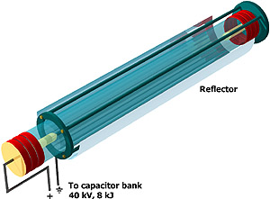 Konstrukční řešení výbojek zaručuje, že elektrický výboj nastává vždy v blízkosti osy výbojky, což minimalizuje zatížení křemenné trubice a tím i nebezpečí jejího poškození či destrukce. Elektrický proud je veden zpět podél výbojky čtyřmi symetricky umístěnými uzemněnými tyčovými vodiči; kovový optický odražeč, sloužící k vazbě čerpacího UV záření z výbojky do aktivního prostředí, je na plovoucím potenciálu. Pole uvnitř výbojky je tedy plně určeno elektrodami a tyčovými vodiči a je osově symetrické. Xenonová náplň výbojek je ve všech zesilovačích pravidelně obměňována. Cílem této obměny je odstraňování molekulárních nečistot, které by snižovaly výkon a životnost výbojek. Všechny výbojky jsou chlazeny uzavřeným dusíkovým okruhem, který během několika minut po výstřelu obnovuje jejich tepelnou rovnováhu (systém navíc ochlazuje kyvetu zesilovače). Výměna výbojek se provádí po 600 až 1 000 výstřelech na úrovni maximální energie.