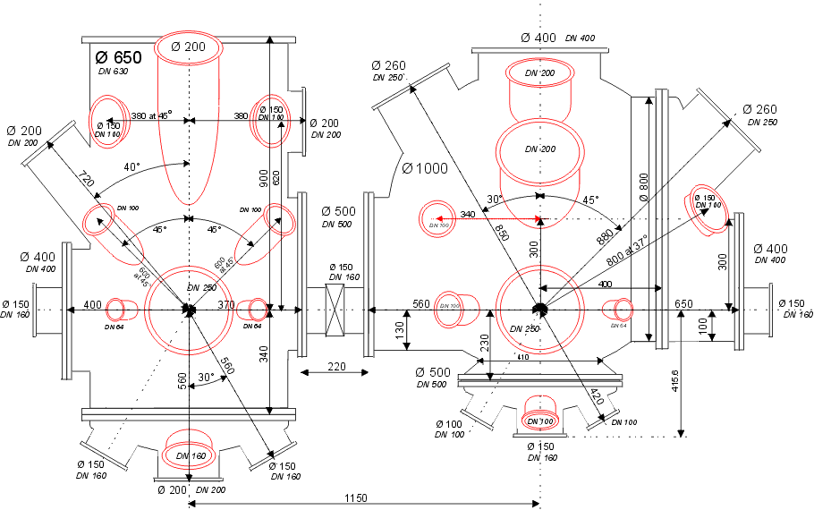 Hlavní komora (vlevo) je tvořena vakuovou kulovou sekcí z nerezové oceli o průměru 100 cm, vybavenou 80-cm eliptickým víkem, které slouží jako hlavní vstupní dveře. Víko je opatřeno pneumatickými uzamykacími mechanismy, které zajišťují jednak rychlý přístup do vnitřku komory po jejím napuštění, jednak vakuovou těsnost při jejím vyčerpávání. Další vstup do komory o průměru 50-cm, opatřený rovněž vakuovým závěsným víkem, je umístěn naproti vstupního okna pro hlavní laserový svazek. Pro účely diagnostiky a justáže je na komoře dále k dispozici celkem 15 dalších vstupů s přírubami o průměru od 64 mm do 500 mm.
